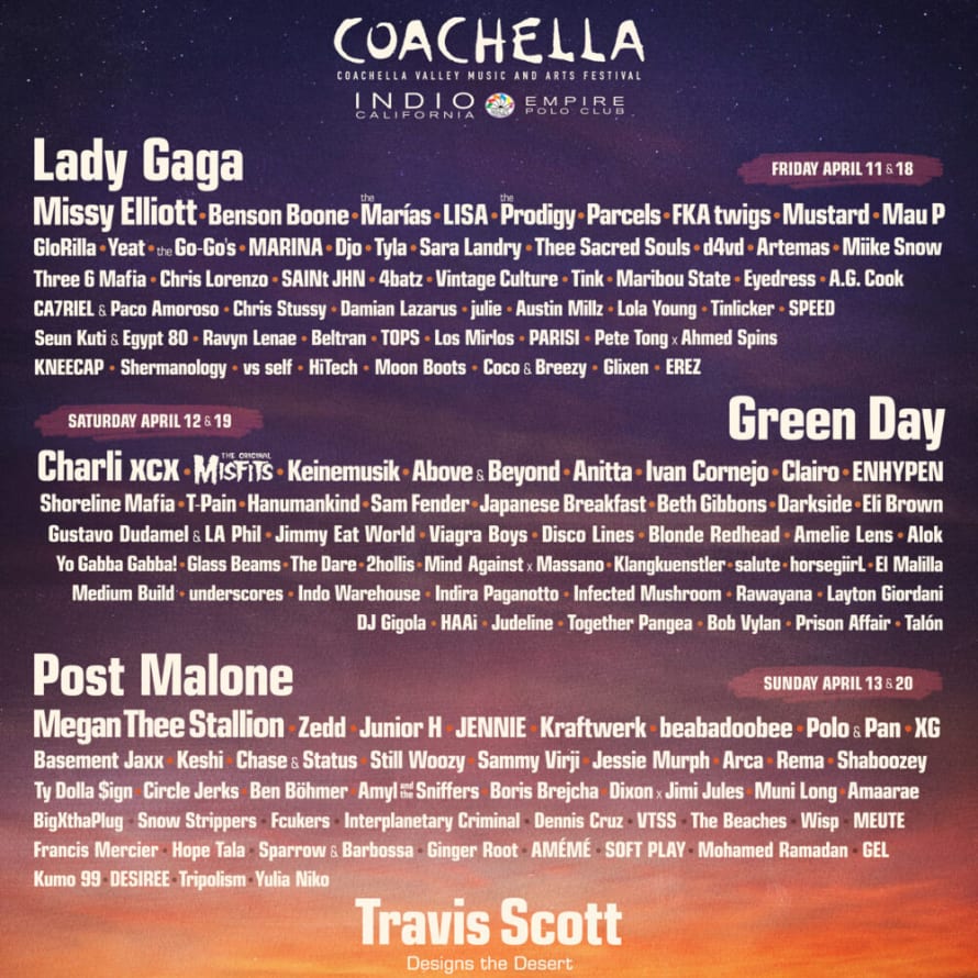 Lady Gaga、Green Day和Post Malone成为了本届Coachella音乐节的主角,Blackpink的Lisa、Jennie今年将以个人Solo的方式登场,还有女团XG以及韩国男团ENHYPEN也出现在了名单中。